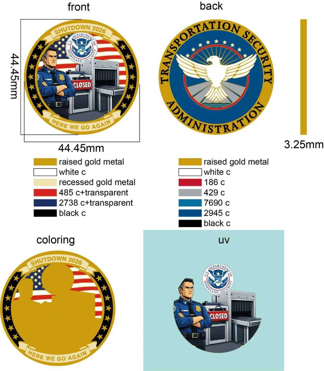 TSA TSA Clear Filters Filter Clear Filter TSA Back 2 Back Shutdown Champs Challenge Coin $20.00 Add To Cart Added! TSA Shutdown 2026 Coin $20.00 Limited Availability Add To Cart Added! TSA Parody Shutdown Coin - 2025 (Round 3 - PREORDER) $20.00 Limited Availability Add To Cart Added! No results found No results match your search. Try removing a few filters.